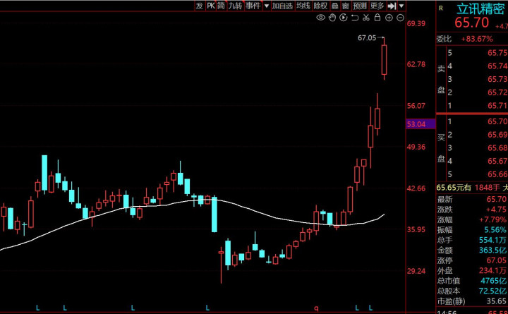 第一家,立讯精密,流通市值4755亿,现价65.7。